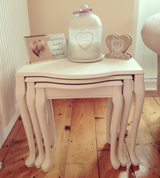 I bought this nest of tables off Gumtree for £5 & gave them a lick of Annie Sloan paint. The frame is from Next, large dome lavender candle from Sainsbury’s & coaster set from Next.