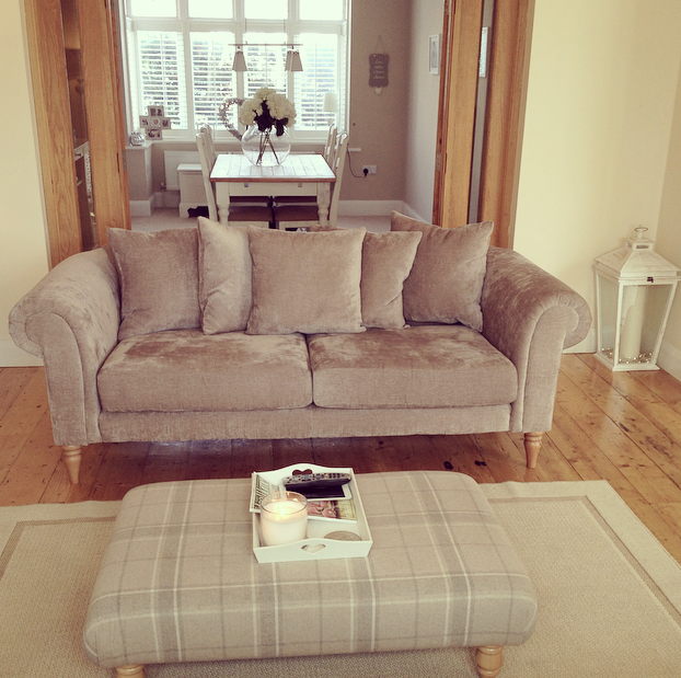 The footstool was ordered once we knew the actual colour of the sofas considering the online picture wasn’t very clear. This was £135 off ebay with a choice of fabric (this is Laura Ashley – wool Highland Check in Natural) from seller serrinainteriors & we also got similar legs to the sofa out of many available.