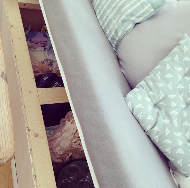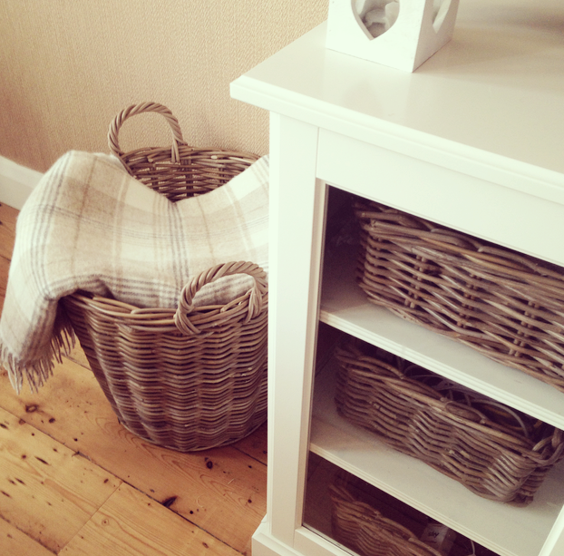 A beautiful oversized basket can hide a multitude of sins. By draping a decorative throw over you can hide all those unsightly bits – this houses Elsa’s potty, Rory’s bumbo, a tray & my laptop.