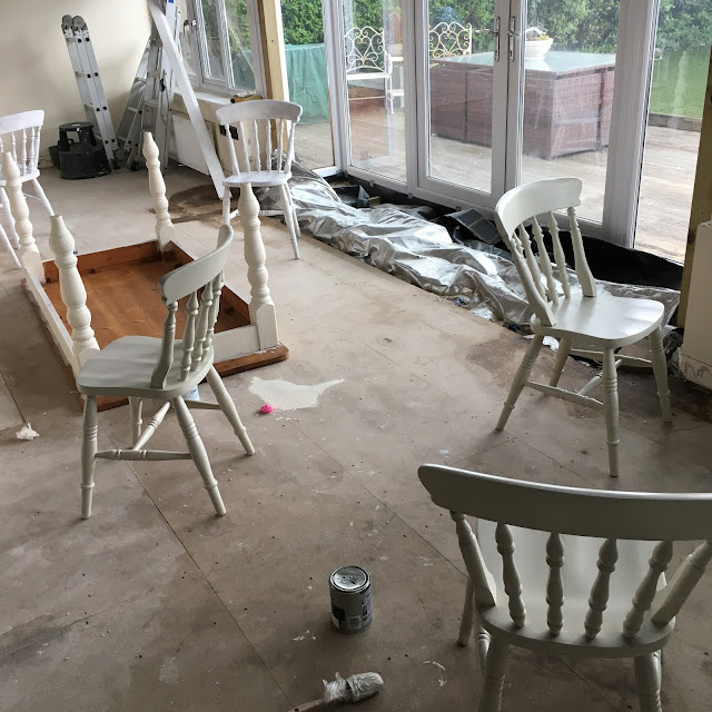 For mine, I used Annie Sloan ‘old white’ on the table legs. I normally always use Annie Sloan chalk paint on my upcycling due to it’s ease of use (no sanding, priming, undercoating!) however I decided to tie in the dining room & kitchen by painting the chairs in the same colour as the kitchen units, Farrow & Ball ‘Stony Ground’.